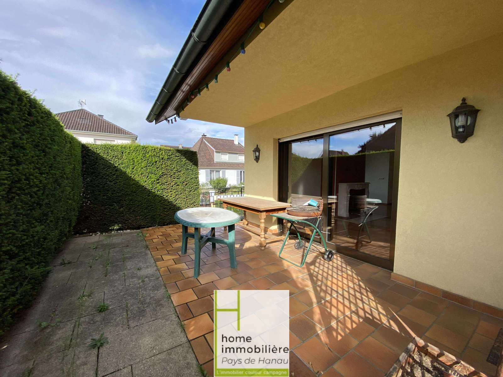 À l’extérieur, vous profiterez d’une belle terrasse donnant sur un jardin arboré, idéal pour des moments en famille.